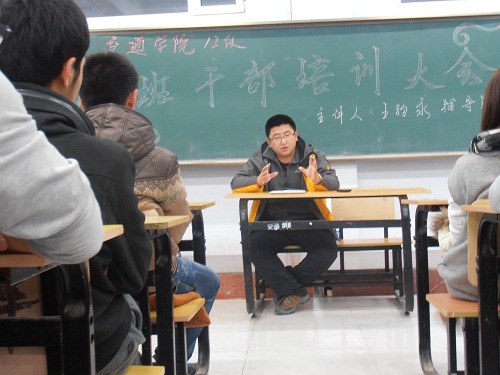11月7日我们又迎来了大二辅导员王钧永老师的培训,他们提到班委们应该以责任、民主、协作、创新为工作理念。在创建优秀班集体的过程中,班委会成员应明确自己肩负的责任,认真负责,发挥班委的作用,同时也要充分发扬团队精神,通力合作,保持年轻新颖的活力,开拓进取。一个好的班级自然会有好的班风和特色,如班徽、班歌、班服等,并且能够组织班里的同学参加公益活动等,增强同学之间的交流,以提高班级的凝聚力。