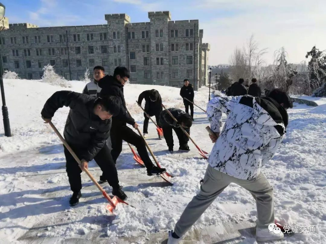 午后明媚的阳光照耀着党员积极分子以及学生干部劳动的背影,就犹如中国共产党的坚定信念和伟大的思想在照耀着我们一般。全体同学们,积极主动,认真仔细地拿着工具清理积雪和冰块。