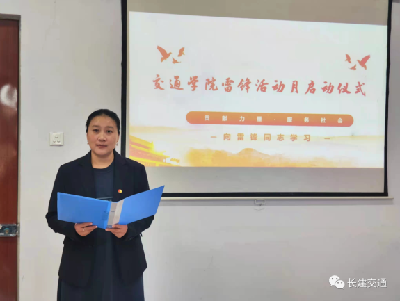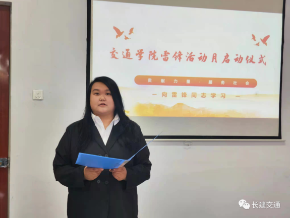 杨婉宣读“学雷锋活动月”倡议书,号召全体学生学习雷锋精神,把崇高理想信念和道德品质追求转化为具体行动,把有限的生命投入到无限的为人民服务当中,热爱学习,助人为乐,发扬无私奉献精神,展现学院风采,做新时代合格的建设者和接班人。