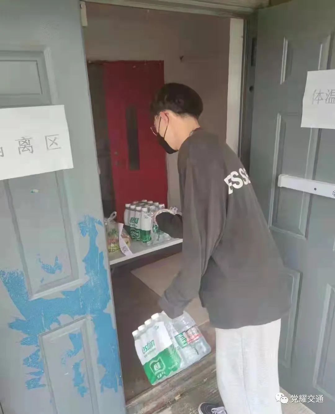 党员志愿者每天详细询问隔离学生的生活起居、身体健康、饮食等情况,为他们送上三餐和生活用品,鼓励他们以阳光乐观的心态,顺利度过隔离期。