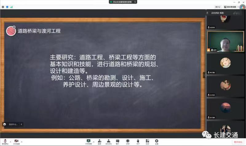 钱晋老师从道路工程、桥梁工程等方面的基本知识和技能,进行道路和桥梁的规划、设计和建造等诸多方面向同学们介绍。随后,他为同学们梳理了学院的历史发展脉络,介绍专业设置、学科建设、以及人才培养质量等方面情况,帮助同学们对学院情况和专业特点有更为深入的了解把握。