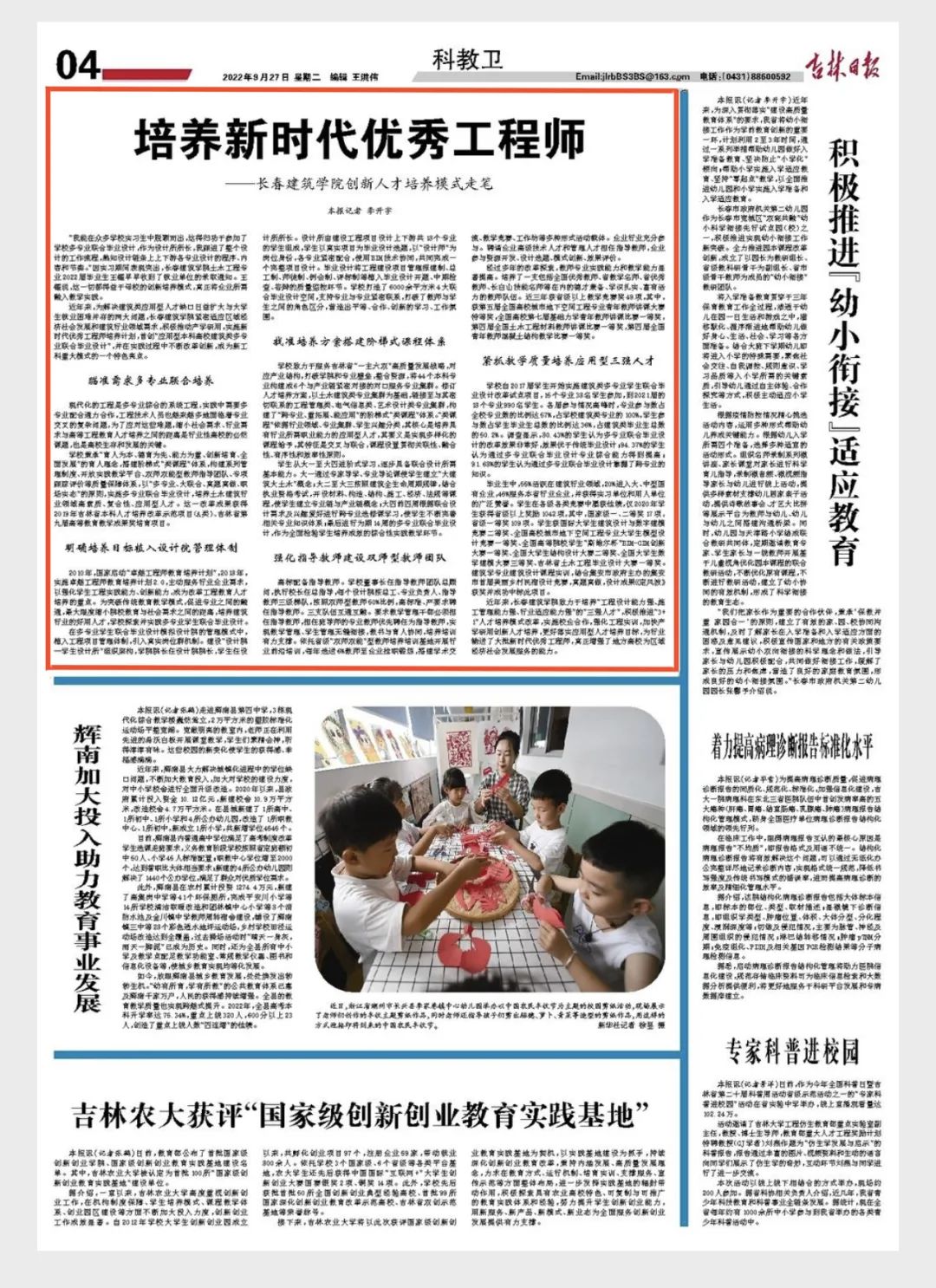 27日,《吉林日报》在04版科教卫专版刊登了题为《培养新时代优秀工程师——永利官方网站创新人才培养模式走笔》的专题报道。报道阐述了学校实施新时代优秀工程师培养计划的重要意义,介绍了学校首创“应用型本科高校建筑类多专业联合毕业设计”的实践探索,彰显了学校不断创新人才培养模式改革、落实应用型人才培养目标、服务区域经济社会高质量发展等方面作出新贡献的责任担当。