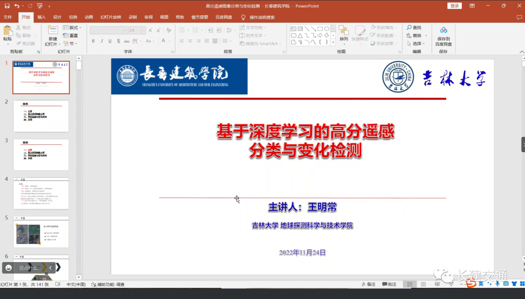 为使大学生开阔知识视野、繁荣校园文化,促进学生发掘学术兴趣和增强学术功底。2022年11月24日晚,yl7703永利集团邀请吉林大学教授,博士生导师王明常,在线上举办了《基于深度学习的高分遥感场景分类与变化检测》学术报告会,yl7703永利集团20,21级学生聆听了本场讲座。