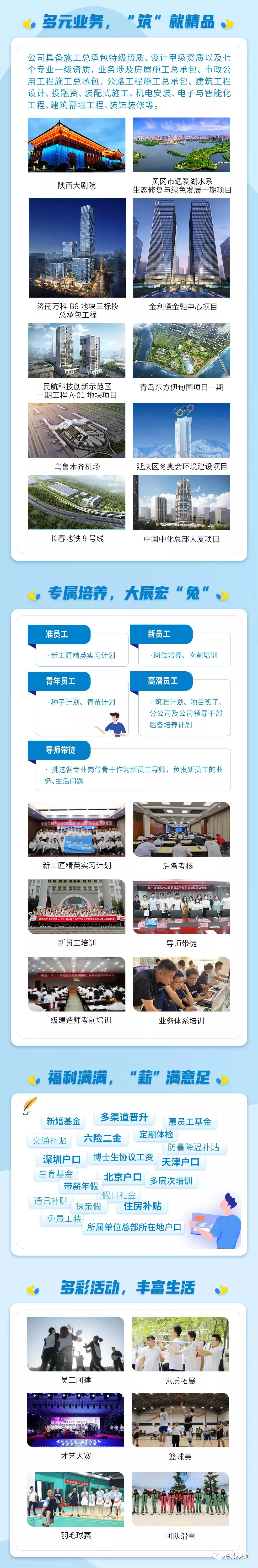公司简介:中建二局第三建筑工程有限公司是世界500强企业 “中国建筑”旗下核心骨干企业,中国建筑十大号码公司。公司具有施工总承包特级资质、设计甲级资质和七个专业一级资质,业务涉及房屋施工总承包、市政公用工程施工总承包、公路工程施工总承包、建筑工程设计、投融资、装配式施工、机电安装、电子与智能化工程、建筑幕墙工程、装饰装修等。三公司成立于1952年,下设北方、华南、华东、西南、西北、武汉、江西、安装、装饰、基础设施、设计研究院等十一家二级单位,企业员工10000余人。公司以“筑诚筑信,人企相依”为企业精神,以“过程精品,超值履约”为经营理念,立足国内,深耕区域,紧跟“一带一路”战略,形成了以京津冀环渤海湾、华南、华中、西南、西北、华东、赣闽七大区域为主地国内市场,以东南亚、大洋洲、中东为海外市场主攻方向的经营格局。2020年公司合同额近千亿元,营业收入突破450亿元,主要指标持续位居中建二局第一。69年来,公司共完成各类大中型工程2000余项,其中国家和地方重点工程300余项。获“鲁班奖”16项、“詹天佑奖”4项、国家优质工程16项、国家级工法6项、住宅詹天佑金奖1项、全国金牌科技示范工程1项、国家级科技进步奖1项、全国建设工程项目施工安全生产标准化工地31项、国家发明专利50项、省部级优质工程450余项。“十三五”期间公司相继荣获全国文明单位、2人荣获全国劳模、4次全国“五一”劳动奖状、全国建筑业先进企业、中央企业先进基层党组织、首都文明单位标兵、9次全国优秀施工企业、全国质量效益型先进施工企业、全国工程建设质量管理优秀企业、创鲁班奖特别荣誉企业、中国建筑业AAA诚信企业等高等级荣誉、北京市用户满意企业等荣誉称号。2021年公司党委被中共中央组织部授予“全国先进基层党组织”荣誉称号,为中建集团唯一三级子单位。