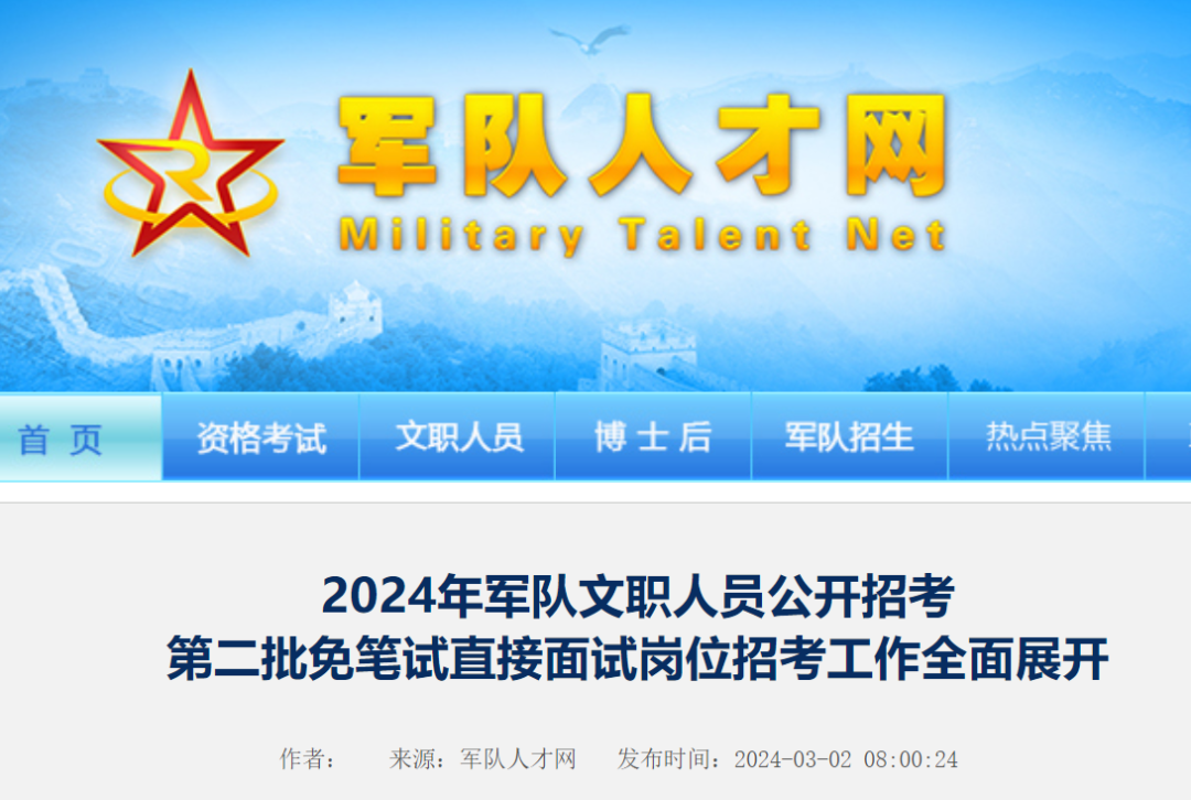 为更好延揽地方优秀人才服务强军事业,根据《军队文职人员公开招考暂行规定》及有关政策规定,中央军委政治工作部将组织2024年军队文职人员公开招考第二批免笔试直接面试岗位招考工作。