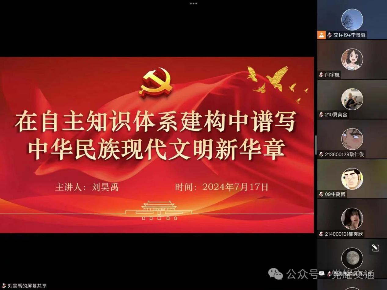 2024年7月17日中午11:00,yl7703永利集团开展《在自主知识体系建构中谱写中华民族现代文明新华章》内容学习。本次学习由学生党员刘昊禹主讲,yl7703永利集团党总支副书记马琰出席。