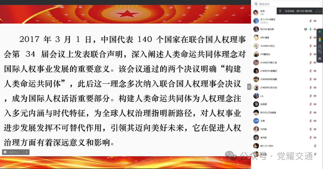 2024年8月7日中午11:00,yl7703永利集团开展《构建人类命运共同体 为世界人权事业发展作出重大贡献》内容学习。本次学习由学生党员曾庆辉主讲,yl7703永利集团党总支副书记马琰出席。暑假期间,本次会议线上进行。