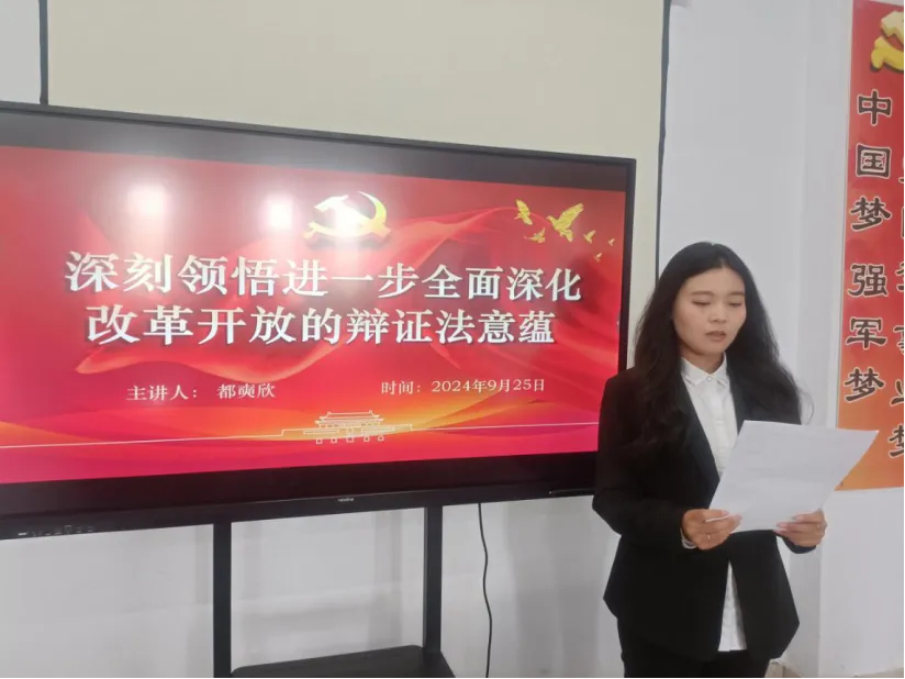 2024年9月25日11点40分,在yl7703永利集团党团活动室召开《深刻领悟进一步全面深化改革开放的辩证法意蕴》的主题会议。出席此次会议的领导有:yl7703永利集团党总支副书记马琰以及yl7703永利集团全体学生党员。本次会议的主持:都奭欣。