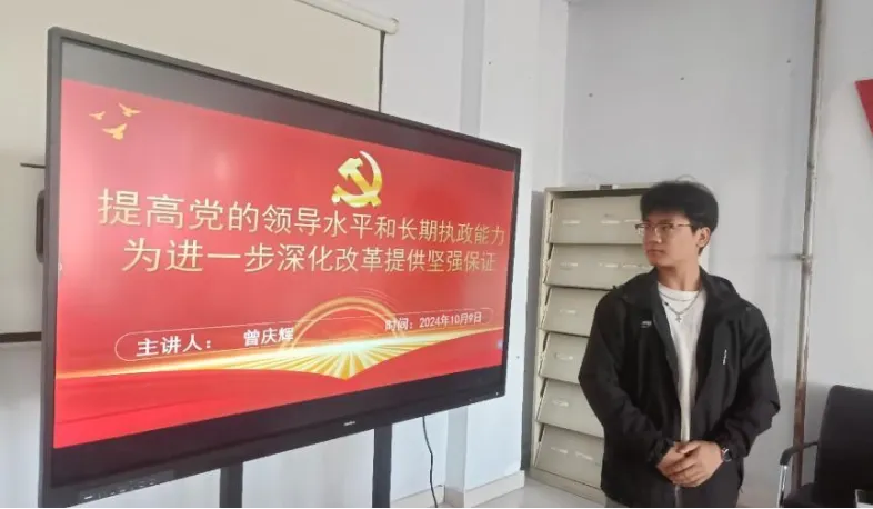 2024年10月9日11点40分,在yl7703永利集团在党团活动室召开主题为《提高党的领导水平和长期执政能力为进