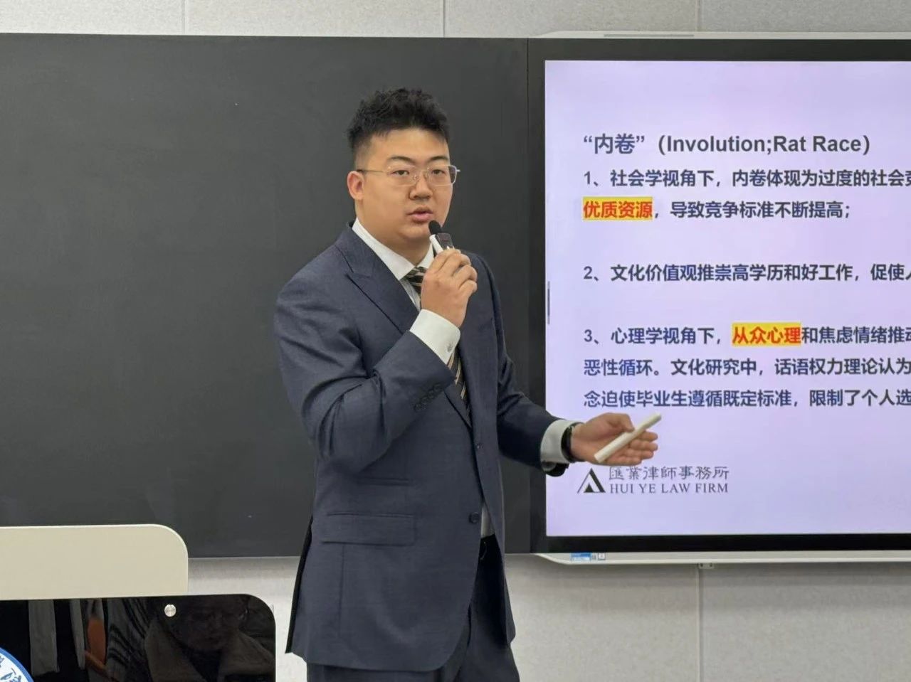 陈达学长也表达了自己的观点,他提到“内卷”已然成为我们无法回避的现象,同时利用鲜明的数据图,让同学们更直观的感受到工作竞争的严酷,要实实在在地锤炼自身专业素养与实践操作能力,面对“内卷”要时刻保持清醒的认知与理性的判断,不局限自己的目光和视野,拓宽自己的思维,紧紧围绕自我能力提升这一核心目标,不盲目跟从,在竞争期间更加从容坚定。