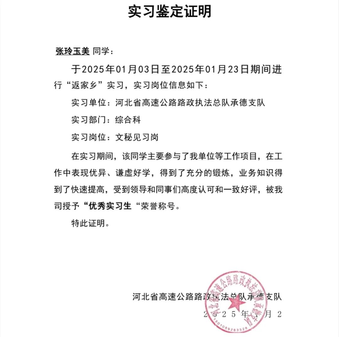 2025 年 1 月 3 日至 23 日,张玲玉美同学来到河北省高速公路路政执法总队承德支队综合科,担任文秘见习岗。这段实习经历,对她而言,是成长的阶梯,更是认知社会的一扇窗口。