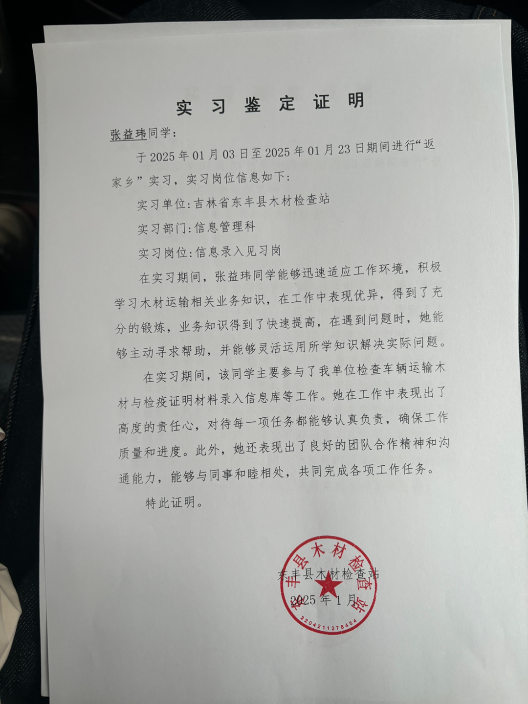 寒假期间,yl7703永利集团交通工程 2402 班的张益玮同学积极投身于家乡吉林省东丰县木材检查站的社会实践,用实际行动诠释当代大学生的责任与担当,展现了青春风采。