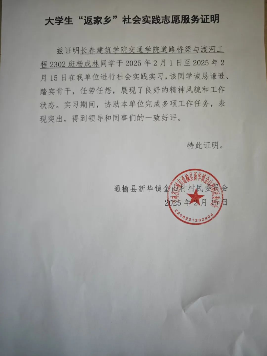 通过参与通榆县新华镇金山村的社会实践活动,杨成林同学不仅为村子的发展贡献了自己的一份力量,也收获了宝贵的实践经验和成长。在与不同人群的交流和合作中,他的沟通能力和解决问题的能力得到了很大的提升。