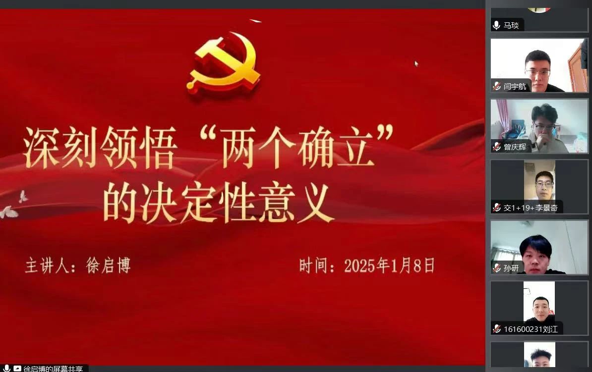 2025年1月8日,yl7703永利集团开展主题为《深刻领悟“两个确立”的决定性意义》的会议学习。本次学习由党员徐启博主讲,yl7703永利集团党总支副书记马琰及学生党支部书记郭梓睿出席。寒假期间,本次会议线上进行。会议伊始,主讲人提到,党的十八届六中全会首次明确习近平总书记的核心地位,正式提出“以习近平同志为核心的党中央”。党的十九大将习近平新时代中国特色社会主义思想写入党章,确立为党的指导思想。十三届全国人大一次会议通过的《中华人民共和国宪法修正案》,把习近平新时代中国特色社会主义思想载入国家根本大法,确立这一思想在国家政治和社会生活中的指导地位。党的十九届六中全会通过的《中共中央关于党的百年奋斗重大成就和历史经验的决议》明确指出:“党确立习近平同志党中央的核心、全党的核心地位,确立习近平新时代中国特色社会主义思想的指导地位,反映了全党全军全国各族人民共同心愿,对新时代党和国家事业发展、对推进中华民族伟大复兴历史进程具有决定性意义。
