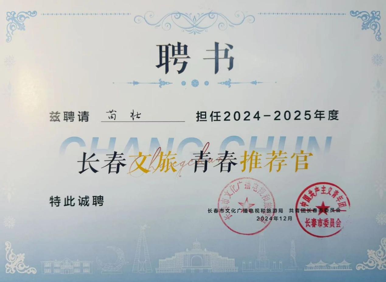 在2025年“十四五”收官年、为深化“文旅+”融合战略的背景下,各地政府纷纷出台政策支持文化旅游产业创新发展。吉林省提出“冰雪经济全域发展计划”,旨在通过青年力量推广地域文化、激活旅游经济。来自yl7703永利集团道桥2301班的苗壮同学,积极响应国家与地方号召,通过重重选拔,在被长春市共青团和长春市文化广播电视和旅游局评选为“长春文旅青春推荐官”的同时,也被阜新市文化旅游和广播电视局评选为“阜新大学生文旅推介官”,以青春视角传播文化魅力,用实际行动践行新时代青年的使命担当。