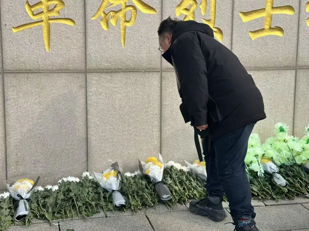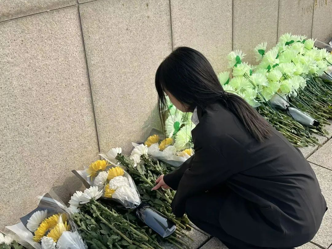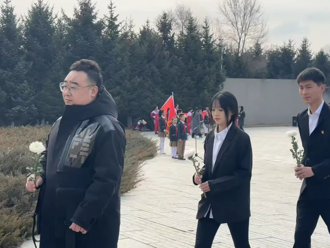 团委书记郭梓睿带领同学们缓步踏上青石台阶。当《献花曲》的旋律在松柏间回荡,轻轻将鲜花摆放在大理石基座上。他们列队默哀时,微风拂过墓碑,那一朵朵素白的菊花宛如振翅的白鸽,将无尽的哀思与敬仰载向碧空,在青松翠柏间定格成永恒的剪影。
