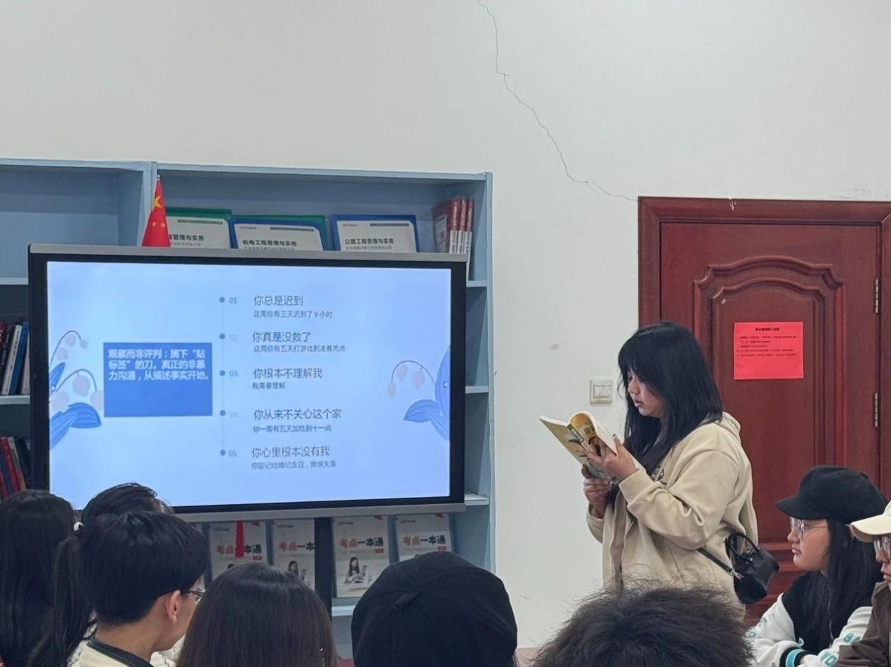 2025 年 4 月 28 日 ,永利官方网站耽书会在校内图书馆举办,参与本次活动的有图书馆老师和yl7703永利集团青年志愿者协会的志愿者们。在活动中,非暴力沟通的理念、技巧和方法被一一拆解、传授。大家认真学习观察、感受、需要、请求这沟通四要素,还在小组模拟沟通场景练习中大显身手。通过实践,不少参与者惊喜地发现,沟通变得顺畅了许多!以前说不清楚的想法,现在能清晰表达;曾经难以理解的对方,如今也能感同身受。沟通冲突大大减少,大家的交流氛围愈发和谐。
