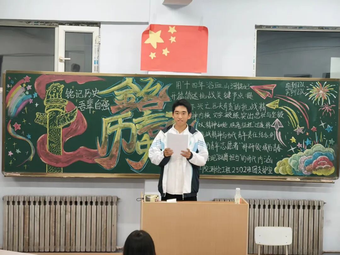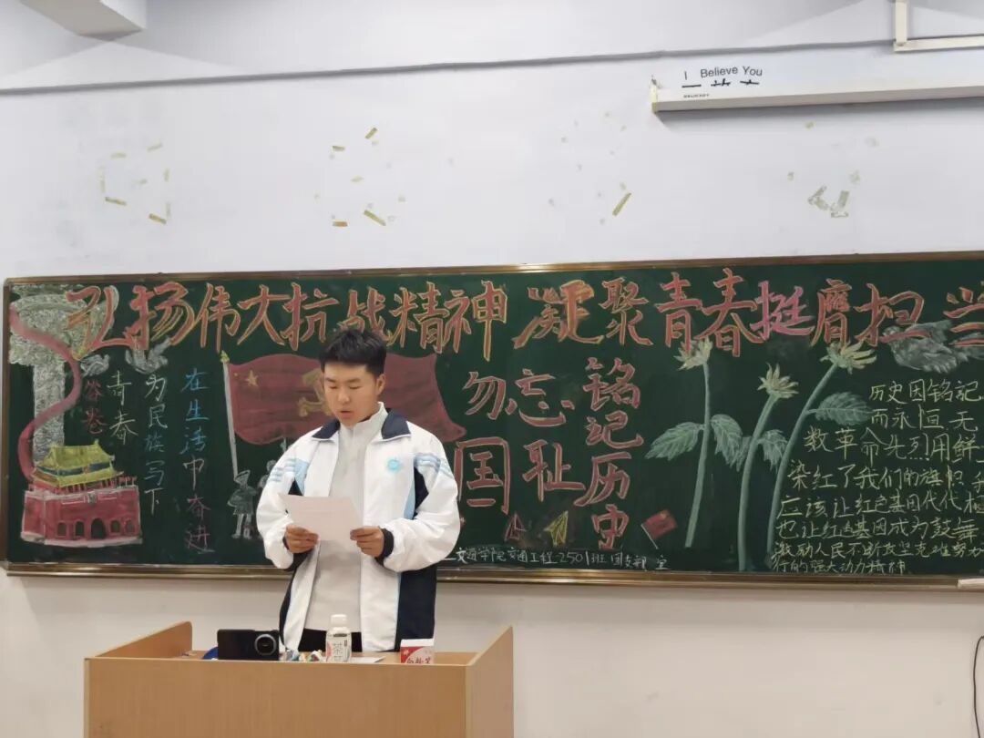 团会伊始,各班团支书向同学们系统阐述了抗战历史的厚重意义与伟大抗战精神的时代价值。同时结合近代以来中华民族的抗争历程,生动讲述了无数先烈为守护家国、抵御外侮所付出的牺牲,强调铭记历史不是为了延续仇恨,而是为了从精神血脉中汲取前行的力量,既点明了本次活动的核心主题,更以真挚的话语激发了同学们的情感共鸣。