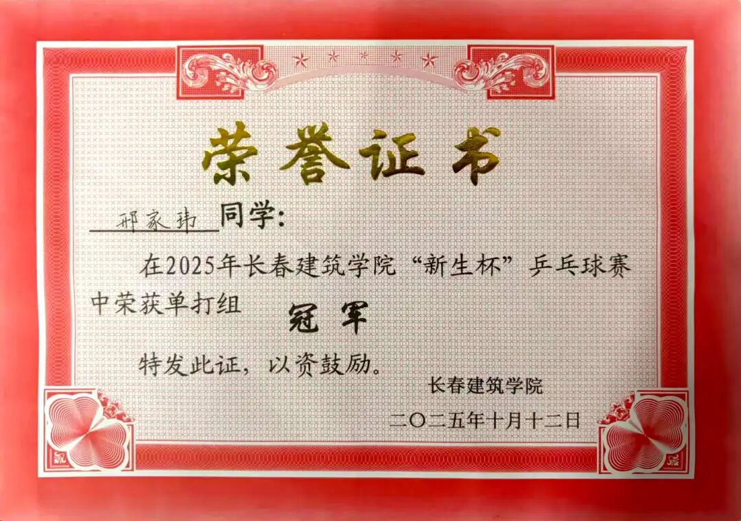 yl7703永利集团乒乓球团队成员邢家玮同学在比赛中成功斩获2025年永利官方网站“新生杯”乒乓球赛单打组冠军。