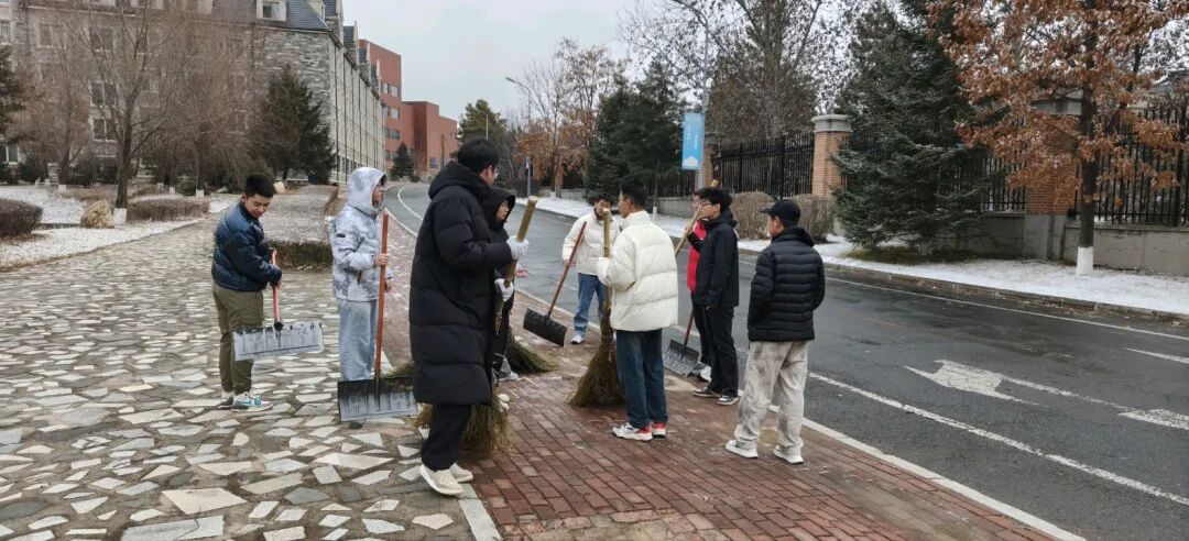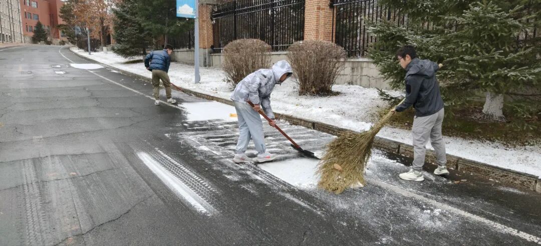 在整个扫雪过程中,学子们手持铁锹、扫帚等工具,迅速奔赴校园主干道与教学楼前的清扫区域。尽管室外气温偏低,寒风袭人。但大家热情不减、斗志昂扬,自发分工、默契无间,现场一派热火朝天的奋进景象。