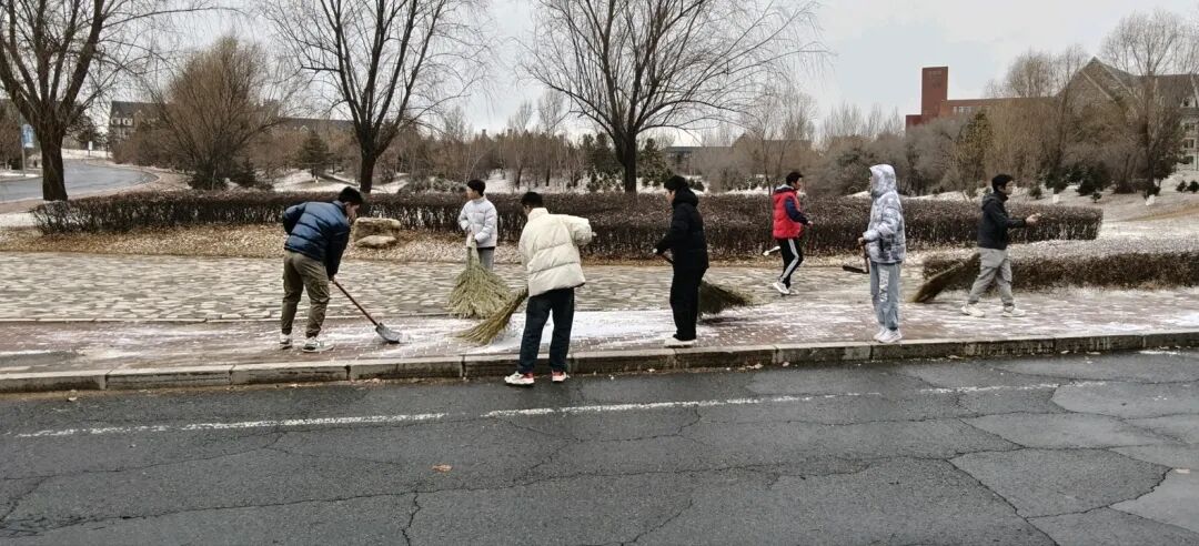 挥锹铲雪时,每一下都坚定有力,凿开冰雪阻隔;挥帚清扫时,每一扫都细致周全,扫清残留雪渣;规整积雪时,每一步都有条不紊,筑牢安全边界。清扫过程中,同学们互帮互助、彼此鼓劲,用双手驱散寒意,用协作攻克难关。经过交通学子们的通力奋战,校园主要道路及关键区域的积雪被彻底清理干净,为师生开辟出一条条安全通畅的出行通道。