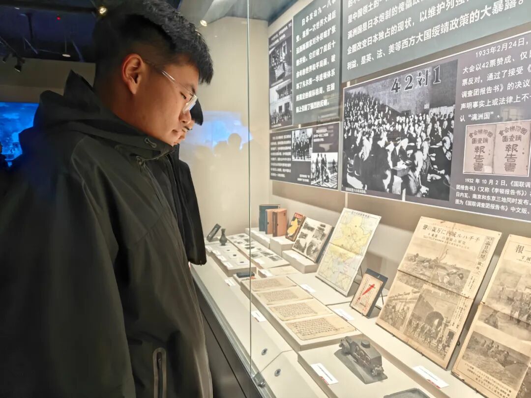 展馆内,“九一八事变”的历史印记在展陈中愈发清晰。泛黄的报刊字里行间浸着民族危亡的焦灼,锈迹斑斑的抗联枪械凝着先烈的热血余温,黑白照片里东北同胞的不屈眼神,与侵略者的暴行画面形成刺目的对比。
