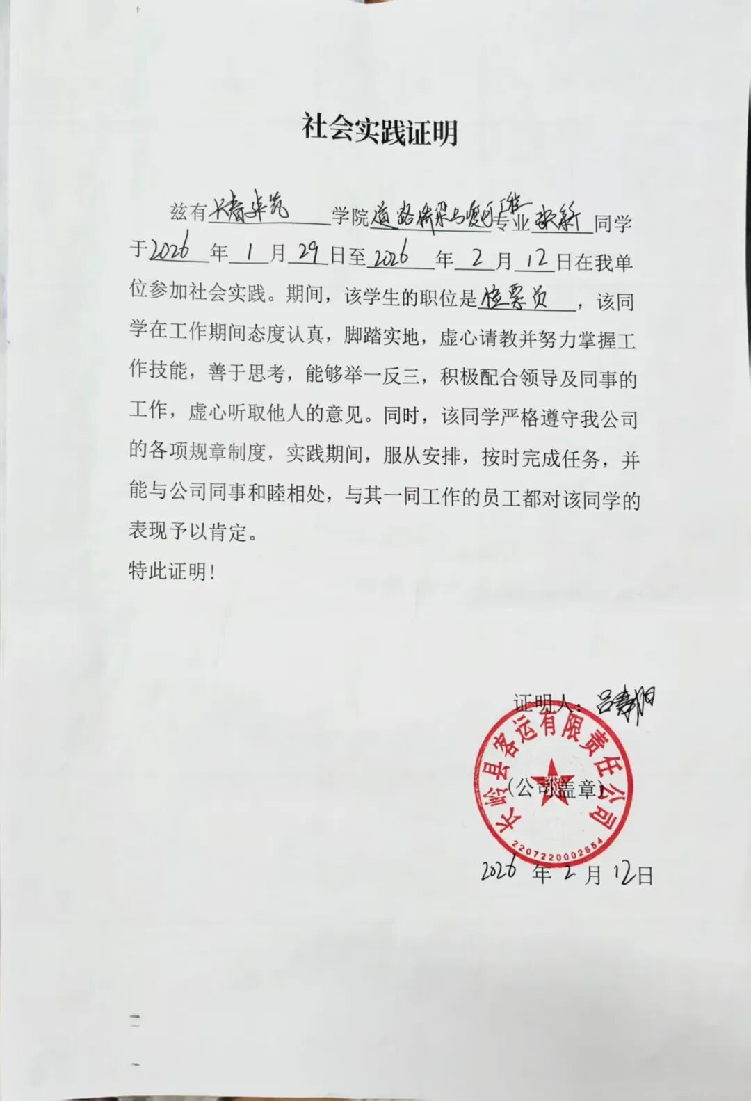 为落实共青团中央“返家乡”社会实践活动部署,让青年学子在服务故土的实践中成长历练,这个冬天,yl7703永利集团道路桥梁与渡河工程专业学子张新踊跃响应号召,以实际行动投身家乡建设,将个人成长融入社会发展的浪潮中,在基层岗位上书写着属于新时代青年的青春答卷。